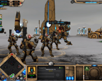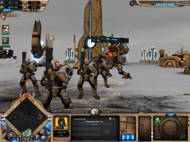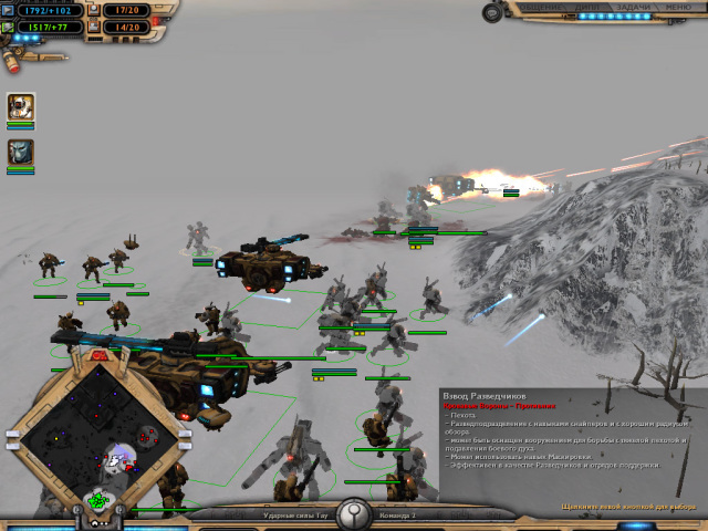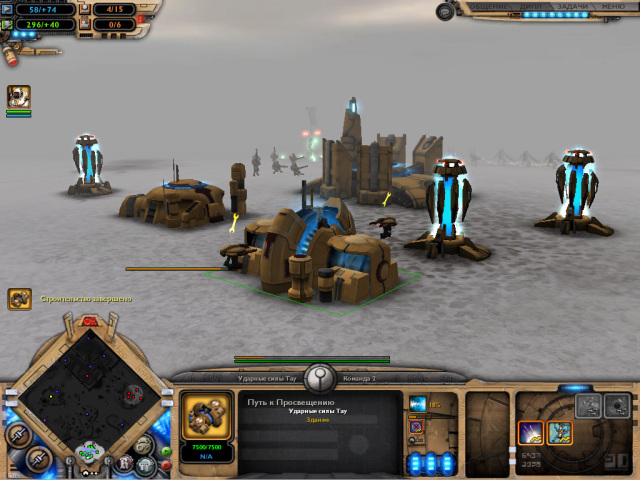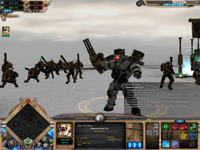 Едва только началась игра, я сразу же принялся нанимать отряды из командного центра. И приказал дроидам строить казармы Воинов. При этом я ещё направил одного строителя возводить генератор. У меня были и стартовые войска. У командира Тау Шас`О`Каиса имелись телохранители из высших каст, а также Разведвзвод с фотонными бластерами.