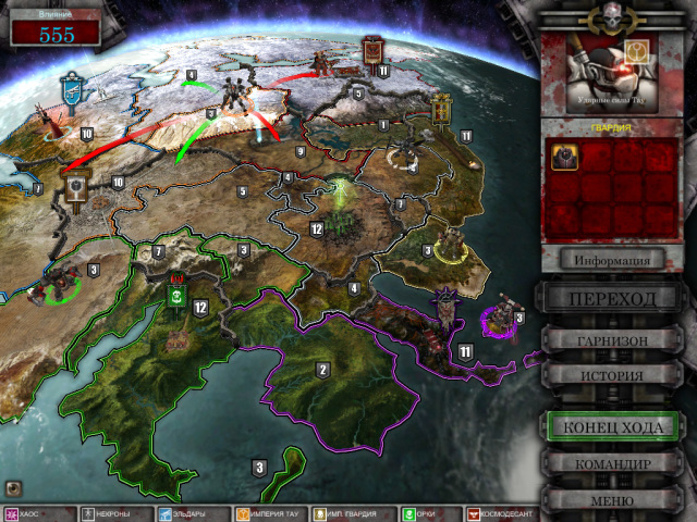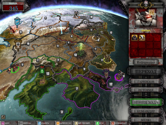 Как видите, карта кампании здесь не такая большая, как в Рим ТВ, но и не маленькая. На карте планеты засели множество фракций, которые ведут между собой кровавую борьбу. Начав играть за Тау, я сразу же отхватил у эльдаров и космодесанта несколько провинций. Бои были быстрыми. Мои самураи укладывали всех на лопатки.