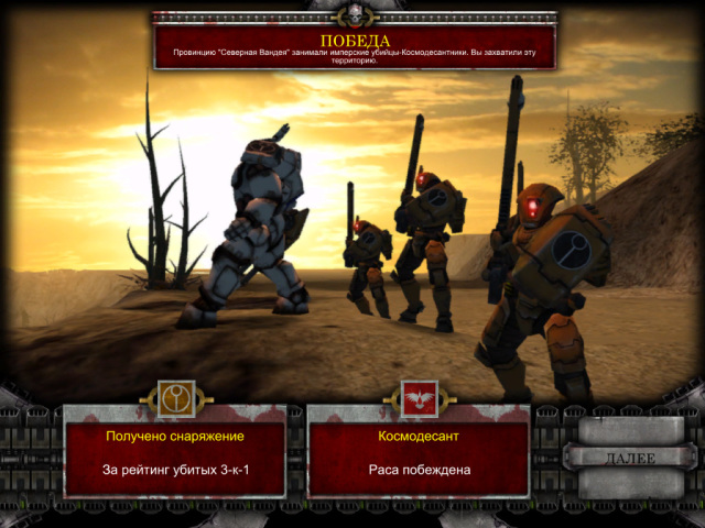 Далее следовал заключительный ролик, в котором погибшего Давиана Тула уносили к кораблю, а вся армия космодесанта приносила себя в жертву. Кровавые Вороны были повержены. И далее выскакивала долгожданная надпись - Победа. За эту победу я получил хорошее снаряжение для Командира Тау.