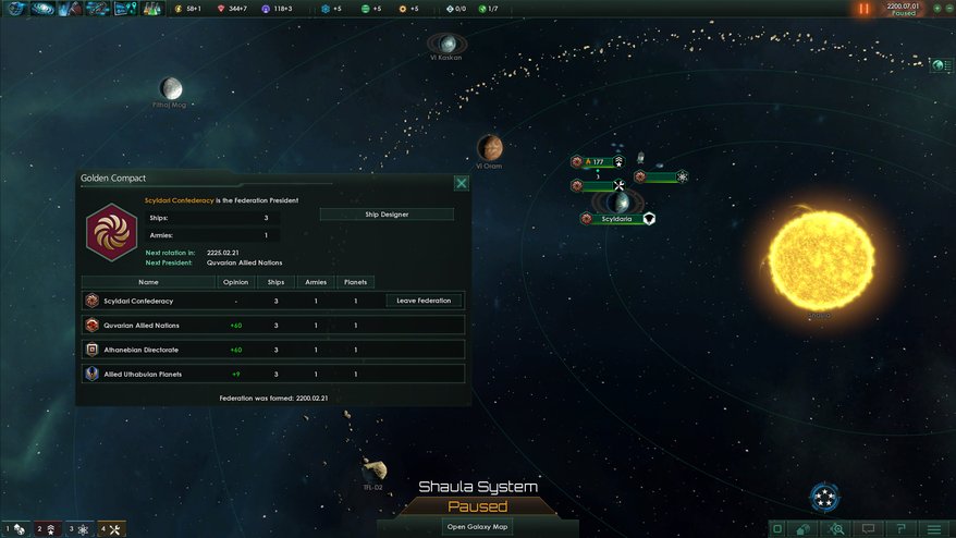 "Еще одной интересной особенностью федераций," говорят менеджеры Парадокс ", является то, что они имеют специальную совместную систему космического флота в дополнение к силам отдельных империй. Президент Федерации получает возможность спроектировать эти шаблоны кораблей, используя все лучшие технологии подчинённых империй. Президент также получает вохможность контролировать эти флоты, конечно. Как правило, одна из подчинённых империй может потребовать независимости и попытаться создать собственную Федерацию, но это как правило, плохая идея. Есть также элемент ролевой игры на выбор ... "