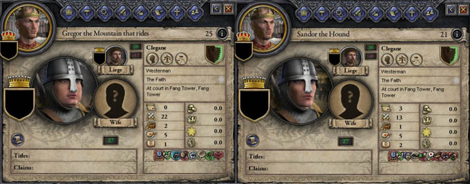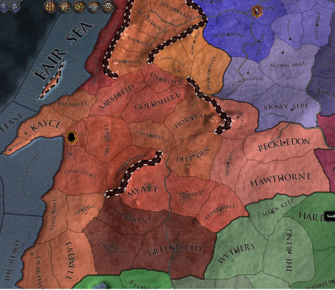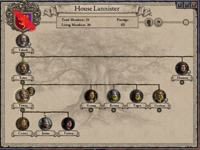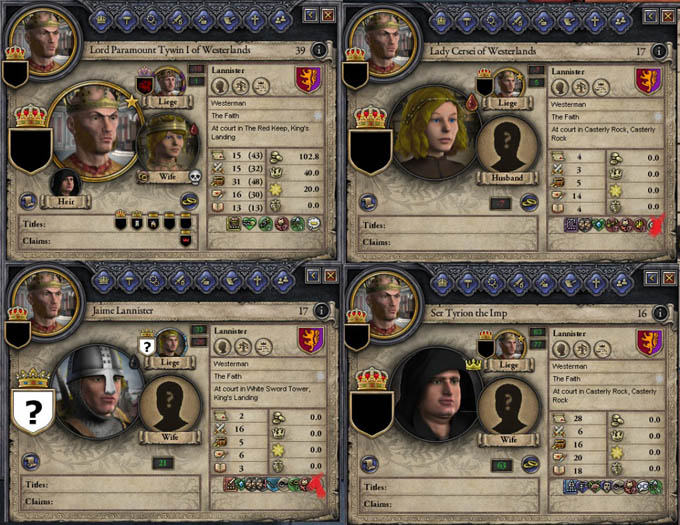 О Западе не так много говорится, в основном о Ланнистерах, Клигинах и Пейнах. Остальные же упоминают лишь по именам или вообще никак. Так что пришлось сделать что у большинства лордов характеристики и статы генерируются при начале игры. Данное решение способствует реиграбельности.