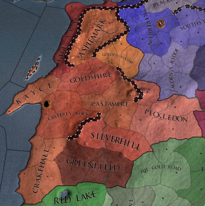 Герцогства, которые были введены в игру. Сомнения вызывало Кастамаре, помните что и Тарбек Холл и Кастамаре – «разрушенные» замки, принадлежащие Тайвину, в то время как Герцогство Кастамаре относится к Глубоким Копям принадлежащий Дому Лидденов с самого начала игры. Предполагается, что Пекледон и Гринфилд будут более населенными зонами, так как они граничат с Риверландом (Речные земли) и с Простором. Более ничего не заслуживает внимания. Немного золотых шахт тут и там, которые дают тонны золота, не стоит о них даже говорить.